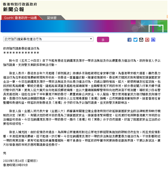 對今日(五月二十四日)自下午起有暴徒在銅鑼灣及灣仔一帶非法集結(jié)及作出嚴(yán)重暴力違法行為,政府發(fā)言人予以強(qiáng)烈譴責(zé),支持警方果斷采取執(zhí)法行動。