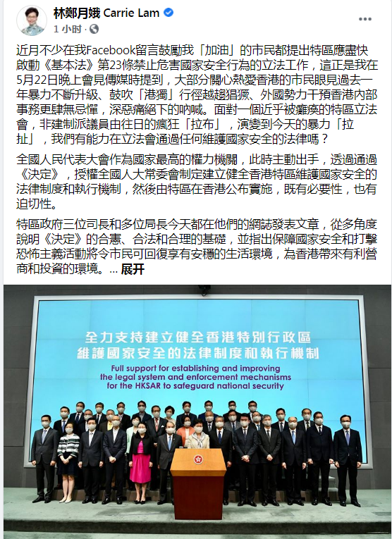 繼22日發(fā)表聲明并于當(dāng)晚會見記者后,24日,香港特區(qū)行政長官林鄭月娥在臉書發(fā)文,第三次談及全國人民代表大會將審議《全國人民代表大會關(guān)于建立健全香港特別行政區(qū)維護(hù)國家安全的法律制度和執(zhí)行機(jī)制的決定(草案)》一事。