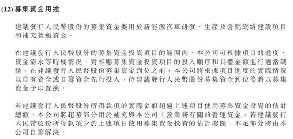 據(jù)悉,建議發(fā)行人民幣股份的募集資金擬用于新能源汽車(chē)研發(fā)、生產(chǎn)及營(yíng)銷(xiāo)網(wǎng)絡(luò)建設(shè)項(xiàng)目和補(bǔ)充營(yíng)運(yùn)資金。