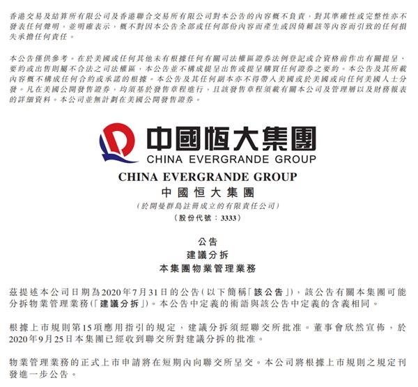 25日,中國(guó)恒大發(fā)布公告稱(chēng),分拆物業(yè)管理業(yè)務(wù)上市已獲得聯(lián)交所批準(zhǔn),將在短期內(nèi)向聯(lián)交所呈交正式上市申請(qǐng)。