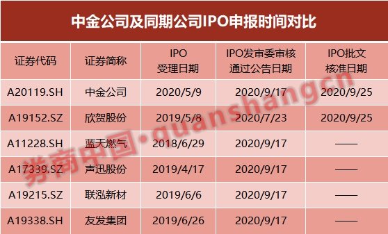 相比之下,中金公司IPO過會是在9月17日,而同日獲得批文的欣賀股份過會則是在7月23日。此外,在9月17日晚間同時過會的5家企業(yè)中,中金公司同樣拔得頭籌。