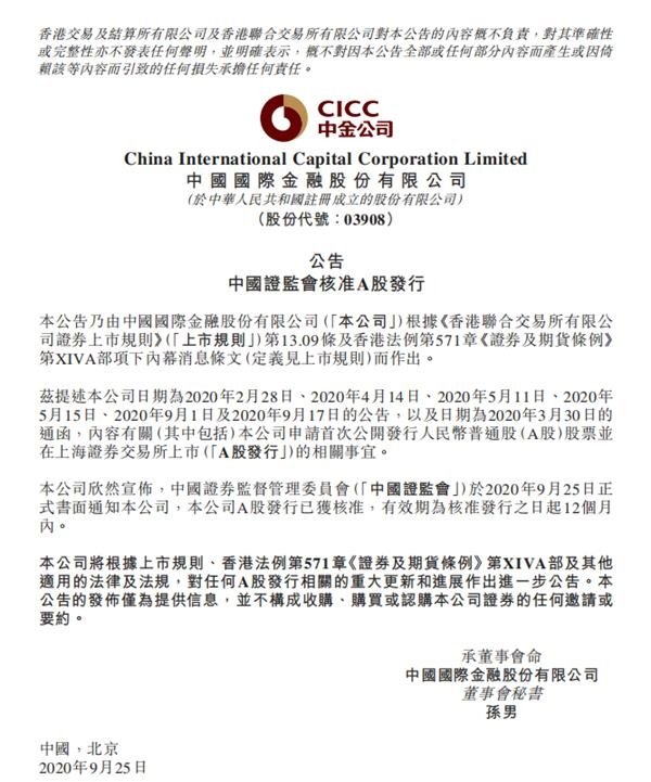 同晚,中金公司也在港股市場“欣然宣布”,證監(jiān)會于9月25日正式書面通知其A股發(fā)行已獲得核準(zhǔn),有效期為核準(zhǔn)發(fā)行之日起12個月內(nèi)。中金公司表示,其將根據(jù)上市規(guī)則、香港法例第571章《證券及期貨條例》第XIVA部及其他適用的法律及法規(guī),對任何A股發(fā)行相關(guān)的重大更新和進(jìn)展做出進(jìn)一步公告。