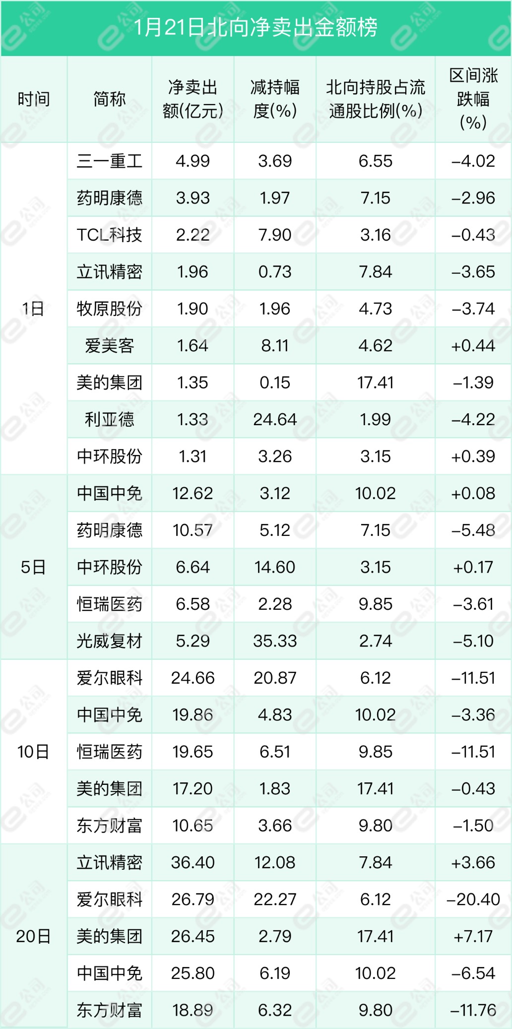 三一重工、藥明康德、【TCL科技(000100)、股吧】遭北向資金凈賣出金額居前,分別為4.99億元、3.93億元、2.22億元,減持幅度分別為3.69%、1.97%、7.9%。