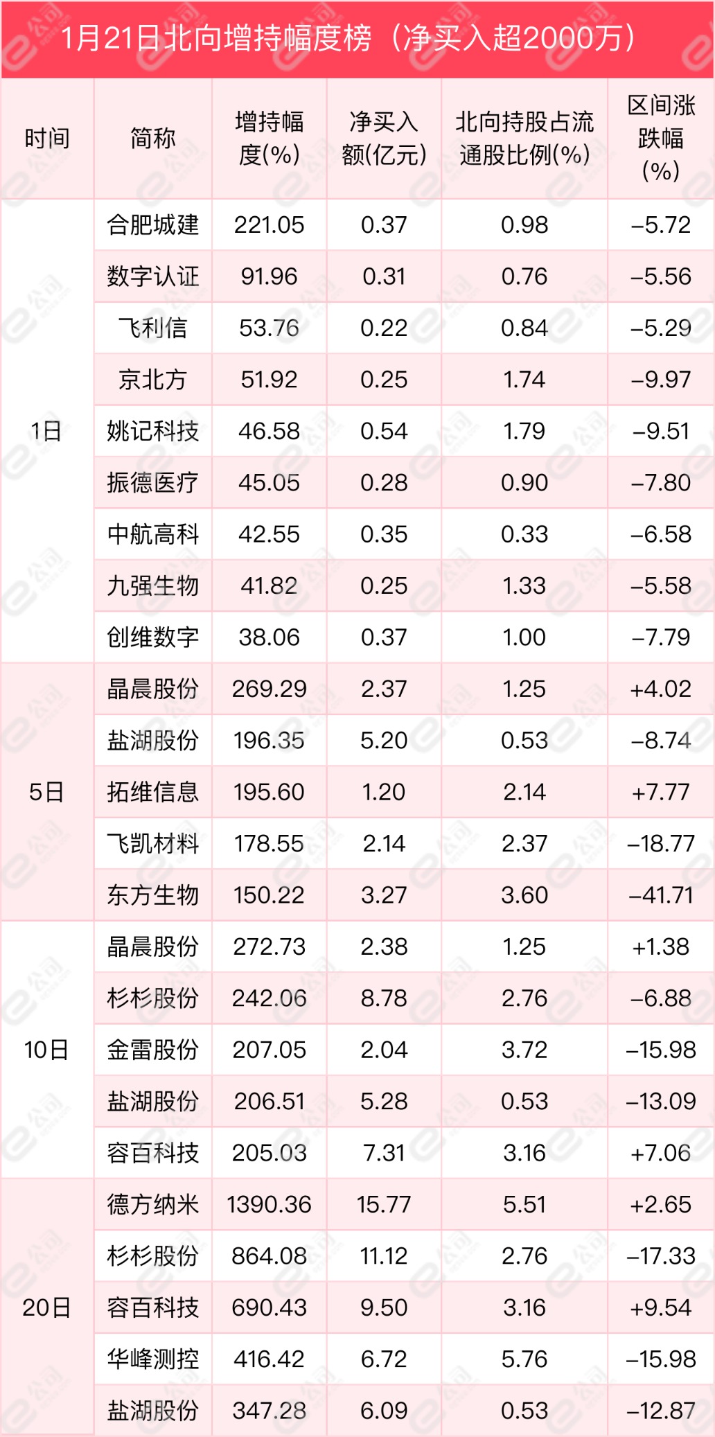 從增減持幅度來看,單日凈買賣超2000萬元以上的個股中,合肥城建、數(shù)字認證、飛利信獲北向資金增持幅度居前,分別為221.05%、91.96%、53.76%。