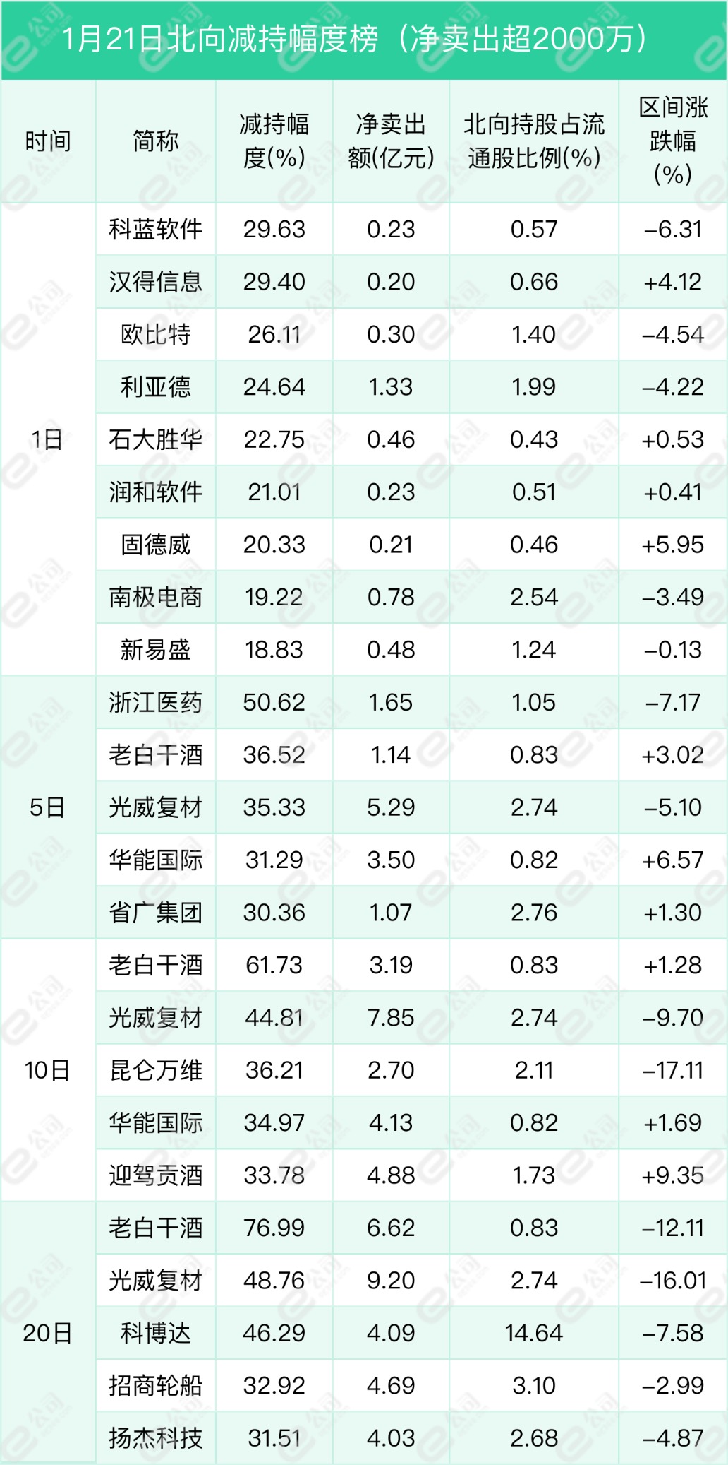 科藍軟件、漢得信息、歐比特遭北向資金減持幅度居前,分別為29.63%、29.4%、26.11%。