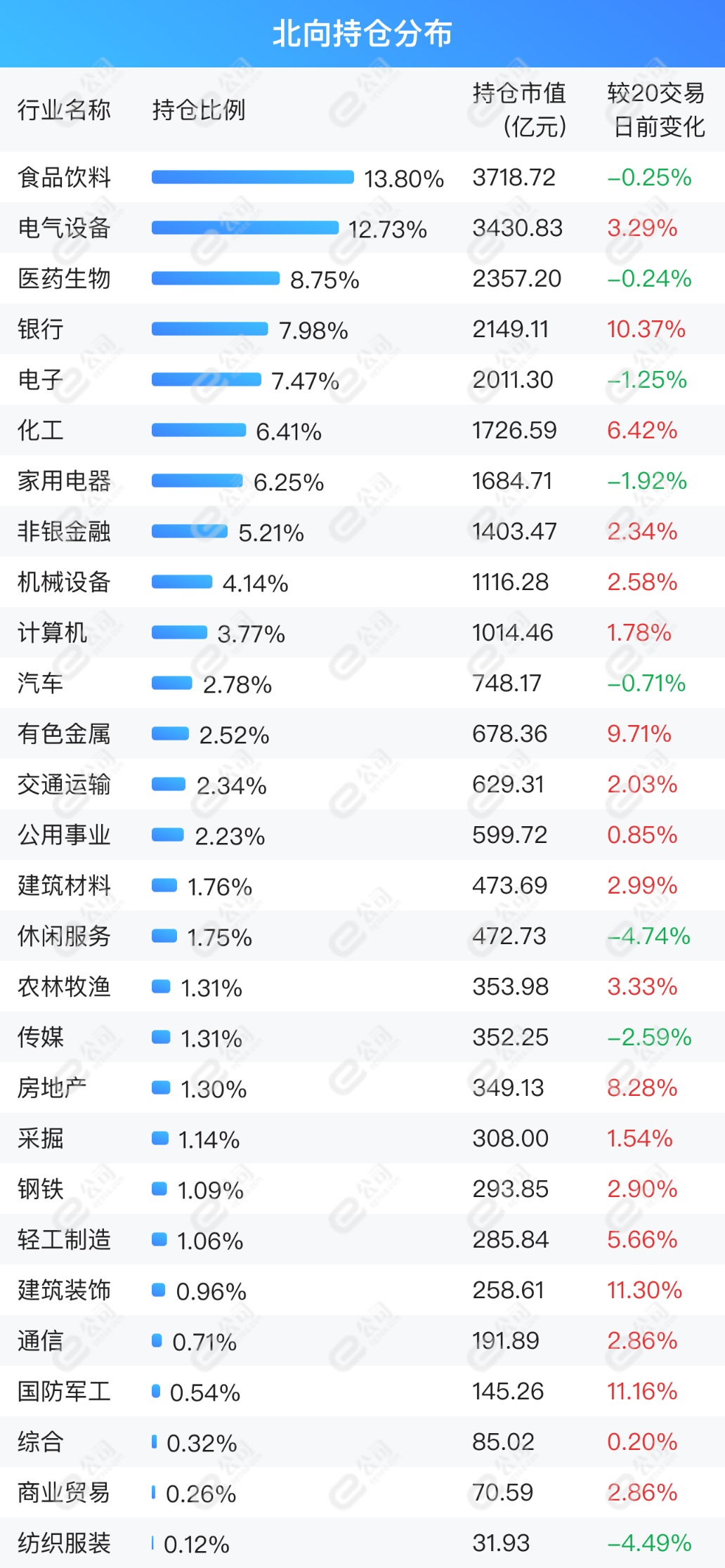 持倉市值較20個交易日前增加幅度前3的行業(yè)為建筑裝飾、國防軍工、銀行,增加幅度分別為11.3%、11.16%、10.37%。