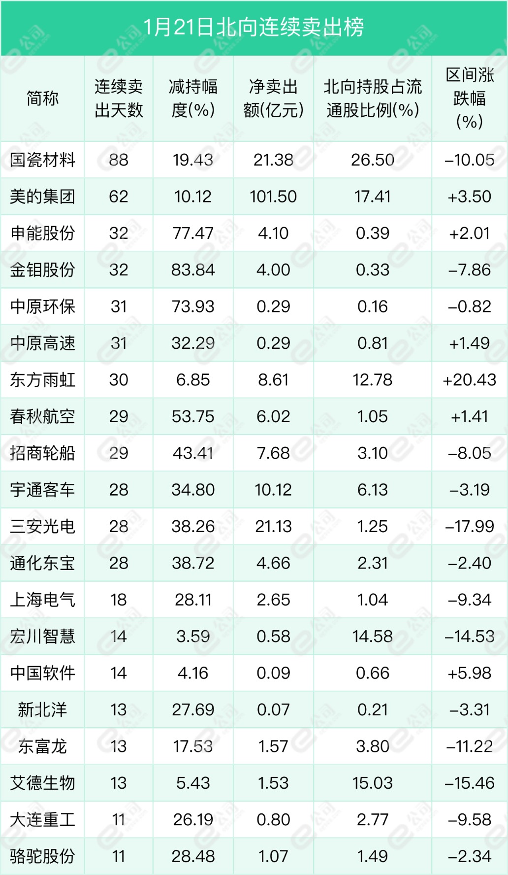 【國瓷材料(300285)、股吧】、美的集團、申能股份遭北向資金連續(xù)凈賣出天數(shù)居前,分別為88天、62天、32天,期間凈賣出額分別為21.38億元、101.5億元、4.1億元,期間減持幅度分別為19.43%、10.12%、77.47%。