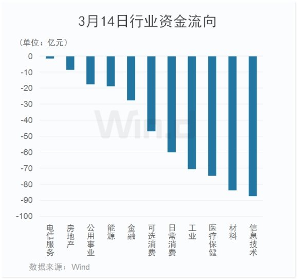 從3月14行業(yè)資金流向來(lái)看,主力資金凈流出400多億元,所有行業(yè)凈流出,其中信息技術(shù)板塊凈流出額超80億元,位居首位;材料、醫(yī)療保健、工業(yè)等板塊緊隨其后,凈流出額均超過(guò)70億元。