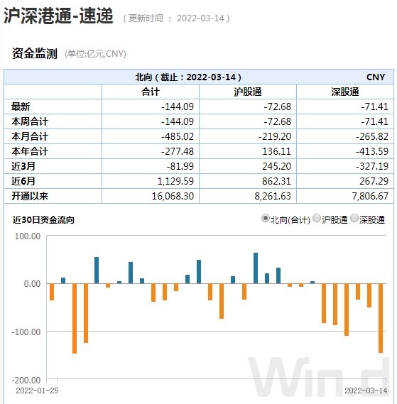 3月14日,北上資金凈賣(mài)出144.09億元,連續(xù)6天凈賣(mài)出,且單日賣(mài)出金額創(chuàng)近幾日新高。從近期北上資金變動(dòng)趨勢(shì)看,近期市場(chǎng)波動(dòng)較大,北上資金選擇連續(xù)大額凈賣(mài)出,或反映出外資的謹(jǐn)慎心態(tài)。