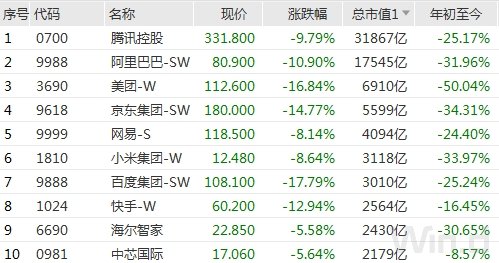 從恒生科技指數(shù)來(lái)看,當(dāng)前市值排名前10名的公司,年初至今多數(shù)跌幅超過(guò)20%,騰訊控股跌幅為25.17%,阿里巴巴跌幅為31.96%,美團(tuán)跌幅甚至超過(guò)50%。