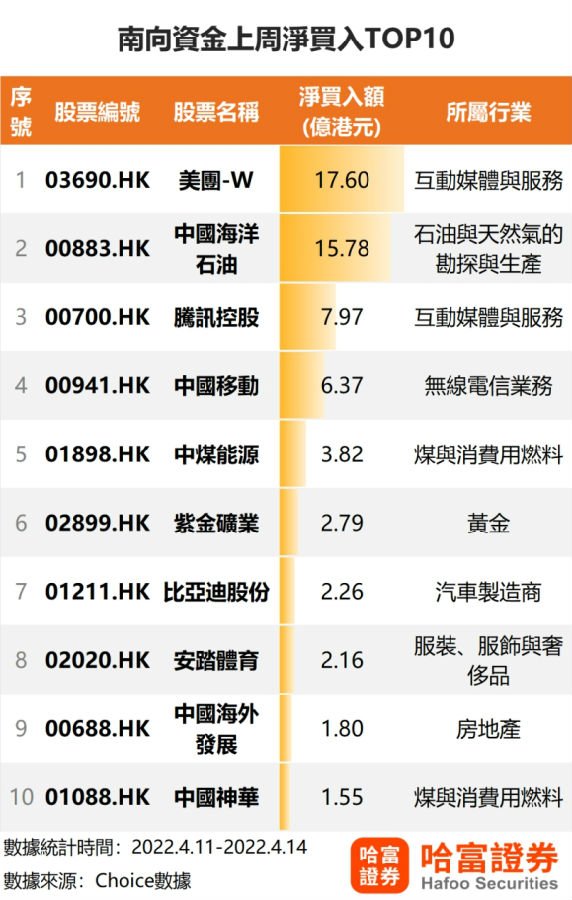 以下為哈富證券整理的上周南向資金凈買入額TOP 10名單: