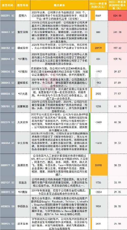 A股不乏與字節(jié)跳動(dòng)/抖音形成大規(guī)模業(yè)務(wù)協(xié)同的上市公司,財(cái)聯(lián)社梳理相關(guān)概念股一季報(bào)增長居前的標(biāo)的如下: