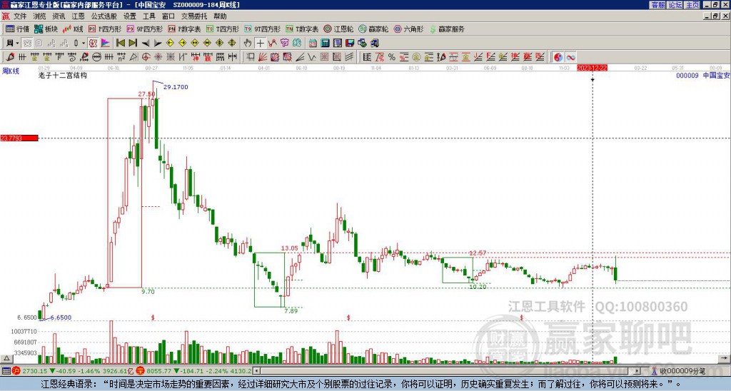 依據(jù)贏家江恩極反通道趨勢工具展示,本周跌破生命線,進(jìn)入弱勢通道, 依據(jù)極反通道規(guī)則,失守一線,看低一線,短期走弱,若此處不能收復(fù)生命線,則繼續(xù)下探至弱勢通道線附近尋找支撐。