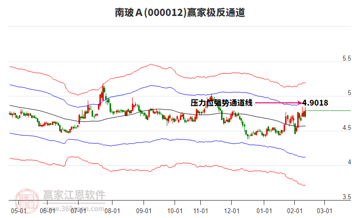 依據(jù)贏家江恩系統(tǒng)趨勢工具極反通道分析判斷南玻A000012運行在生命線以下弱勢區(qū)域,根據(jù)規(guī)則該股短線輕倉參與,股價跌至弱勢外軌線后波段再結合其它工具信號建倉。應用口訣是:生命線上強勢走,生命線下難抬頭;紅黃兩條外軌線,壓力支撐顯勢頭。