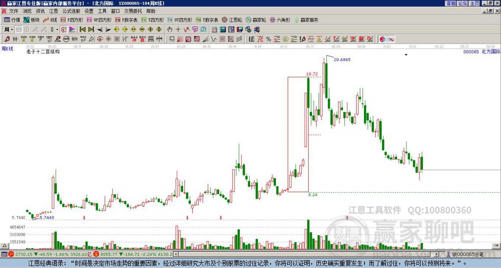 000065北方國際處于贏家江恩多頭中期回調(diào)形態(tài),今日雖重心上移,但短期空頭趨勢未改變,6月24日發(fā)出中期江恩筑底信號后,經(jīng)過230日,今日形成中期筑頂信號,若持續(xù)下跌,觸發(fā)長期筑頂信號,000065