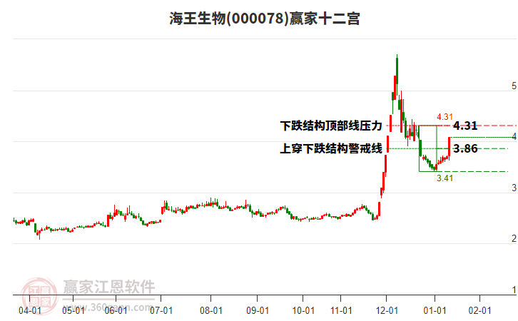 海王生物(000078)根據(jù)贏家江恩極反通道趨勢工具展示,上方壓力位4.9575,下方支撐位3.8204。海王生物(000078)處于贏家江恩多頭次主線形態(tài),1月23日發(fā)出江恩筑底信號后,經(jīng)過6日,今