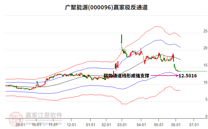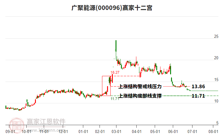 依據(jù)贏家江恩系統(tǒng)趨勢(shì)工具極反通道分析判斷廣聚能源000096運(yùn)行在生命線以下弱勢(shì)區(qū)域,根據(jù)規(guī)則該股短線輕倉(cāng)參與,股價(jià)跌至弱勢(shì)外軌線后波段再結(jié)合其它工具信號(hào)建倉(cāng)。應(yīng)用口訣是:生命線上強(qiáng)勢(shì)走,生命線下難抬頭;紅黃兩條外軌線,壓力支撐顯勢(shì)頭。