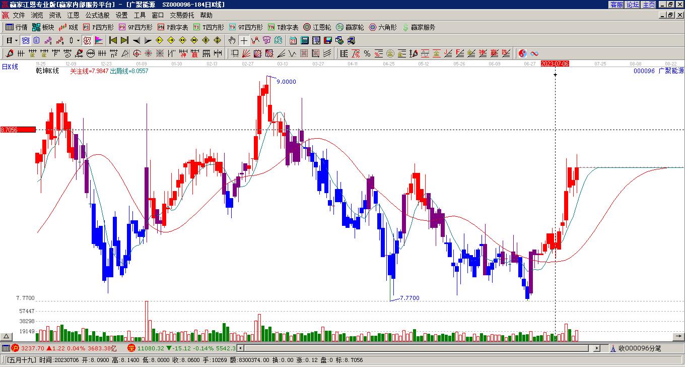 廣聚能源(000096)處于贏家江恩多頭中期回調(diào)形態(tài),8月28日發(fā)出江恩筑頂信號后,經(jīng)過120日,今日再次發(fā)出江恩底分型并發(fā)出江恩筑底信號,中長線均在空頭下跌趨勢中。廣聚能源(000096)根據(jù)贏家江