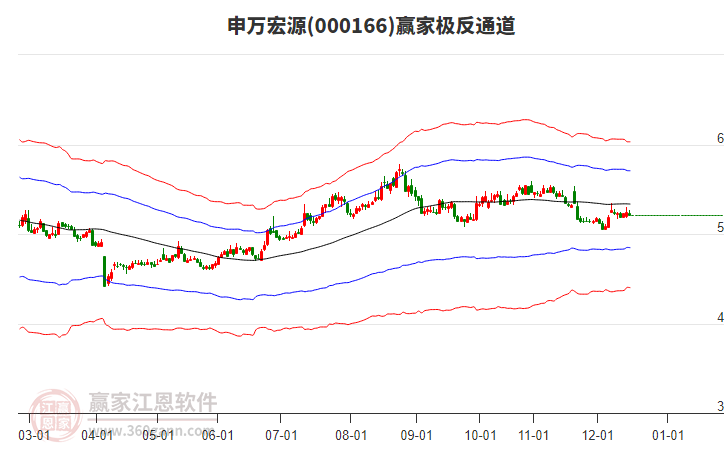 依據(jù)贏家江恩系統(tǒng)趨勢(shì)工具極反通道分析判斷申萬(wàn)宏源000166運(yùn)行在生命線以下弱勢(shì)區(qū)域,根據(jù)規(guī)則該股短線輕倉(cāng)參與,股價(jià)跌至弱勢(shì)外軌線后波段再結(jié)合其它工具信號(hào)建倉(cāng)。應(yīng)用口訣是:生命線上強(qiáng)勢(shì)走,生命線下難抬頭;紅黃兩條外軌線,壓力支撐顯勢(shì)頭。