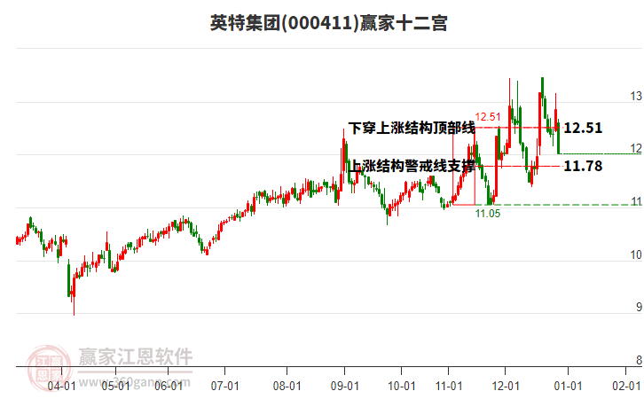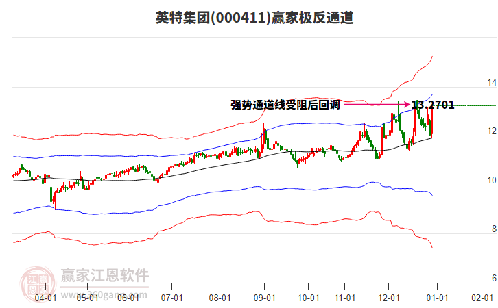 今天英特集團(tuán)000411最高價(jià)13.47上穿了贏家極反通道工具藍(lán)色外軌線,受到藍(lán)色外軌線強(qiáng)力壓制,最終收盤停留在在藍(lán)色外軌線與生命線上方的強(qiáng)勢通道區(qū)域。英特集團(tuán)000411近10個(gè)交易日漲幅3.98%