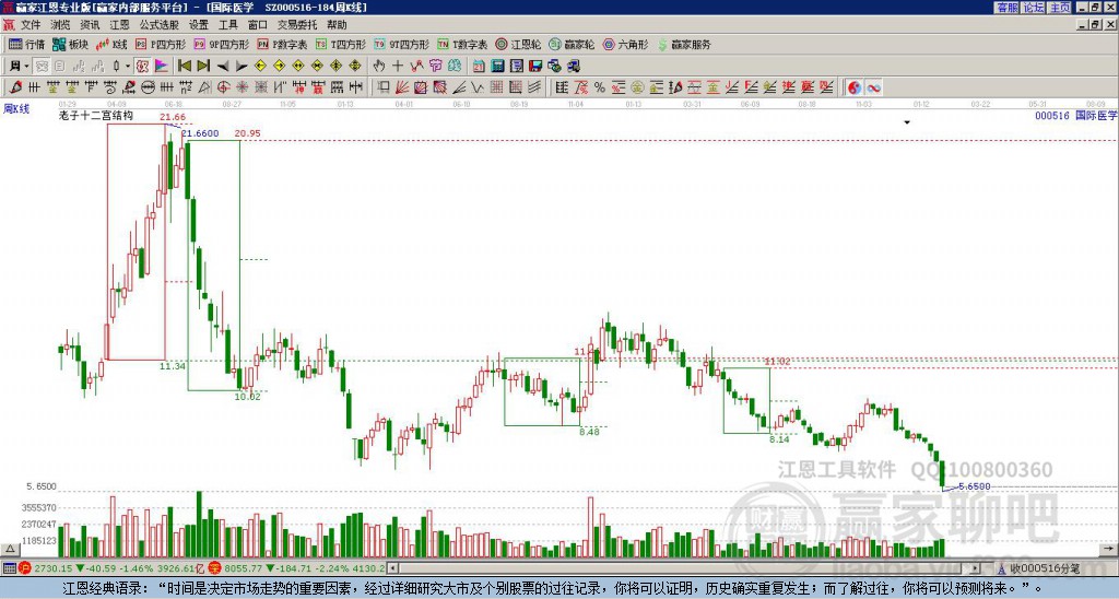000516國(guó)際醫(yī)學(xué)處于贏家江恩多頭次主線形態(tài),1月6日發(fā)出江恩筑底信號(hào)后,經(jīng)過22日,今日形成短期筑頂信號(hào),短期多頭趨勢(shì)已被破壞,中長(zhǎng)期多頭趨勢(shì)依舊保持。000516國(guó)際醫(yī)學(xué)根據(jù)贏家江恩極反通道趨勢(shì)