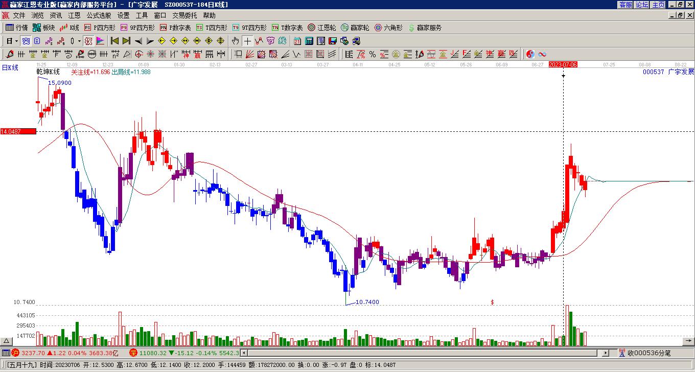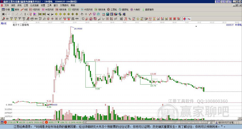 000537中綠電處于贏家江恩空頭主線形態(tài),1月14日發(fā)出江恩筑底信號后,經(jīng)過27日,今日形成短期筑頂信號,短期多頭趨勢已被破壞,中期多頭反彈趨勢延續(xù),但長期處于下跌中。000537中綠電根據(jù)贏家江恩