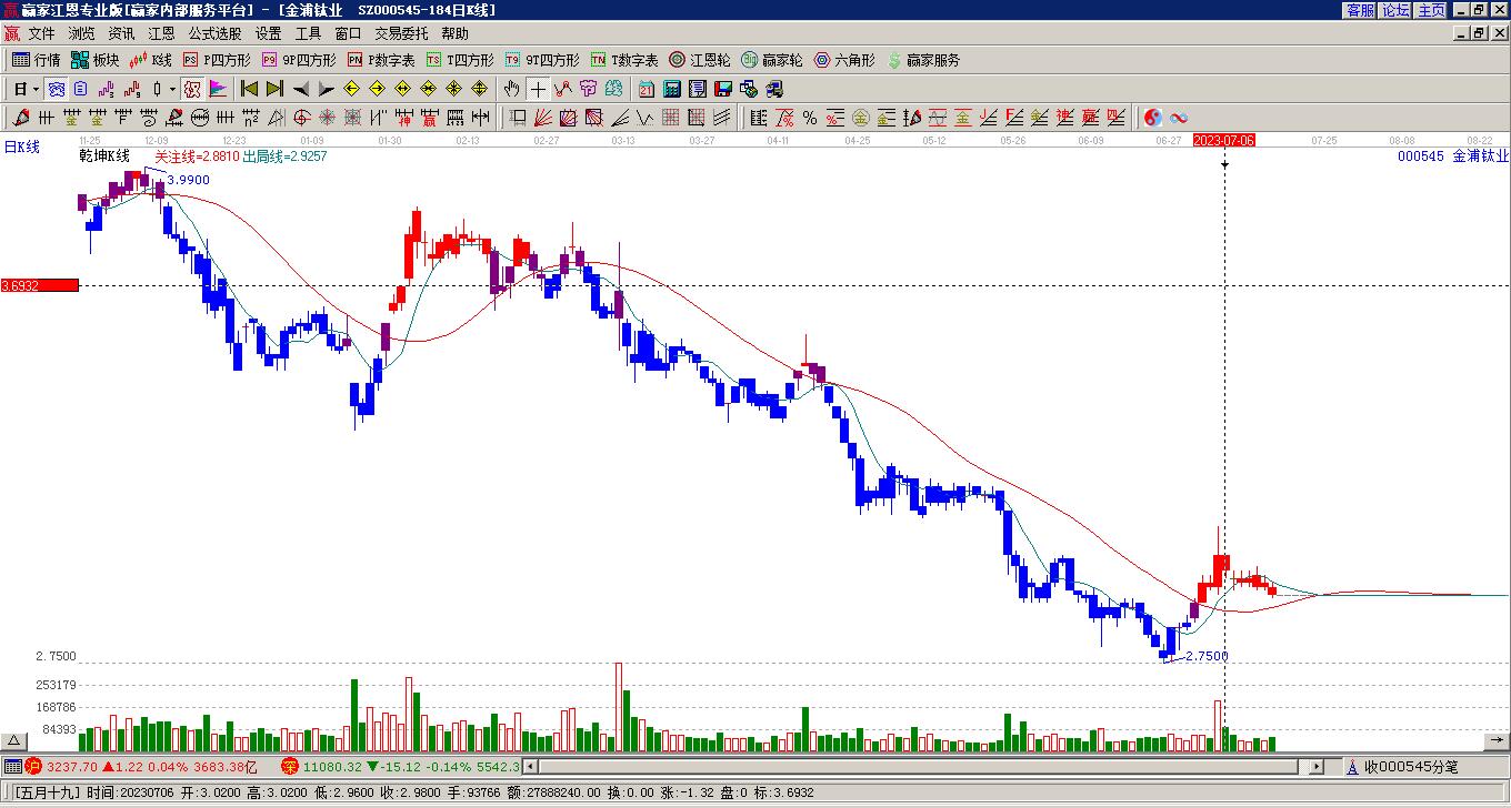 金浦鈦業(yè)處于贏家江恩多頭次主線形態(tài),2月5日發(fā)出江恩筑底信號后,經(jīng)過7日,今日形成短期筑頂信號,短期多頭趨勢已被破壞,中長期多頭趨勢依舊保持。金浦鈦業(yè)根據(jù)贏家江恩極反通道趨勢工具展示,上方壓力位2.9