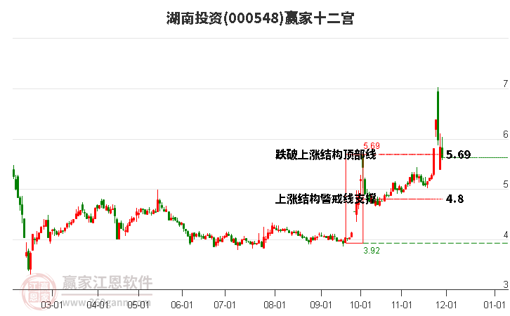 000548湖南投資處于贏家江恩空頭中期反彈形態(tài),今日再次發(fā)出江恩底分型并發(fā)出江恩筑底信號(hào),中期多頭趨勢(shì)延續(xù),但長(zhǎng)期處于下跌中。000548湖南投資根據(jù)贏家江恩極反通道趨勢(shì)工具展示,上方壓力位6.19