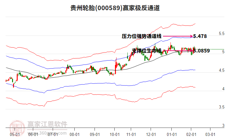 依據(jù)贏家江恩系統(tǒng)趨勢工具極反通道分析判斷貴州輪胎000589運(yùn)行在生命線以下弱勢區(qū)域,根據(jù)規(guī)則該股短線輕倉參與,股價(jià)跌至弱勢外軌線后波段再結(jié)合其它工具信號建倉。應(yīng)用口訣是:生命線上強(qiáng)勢走,生命線下難抬頭;紅黃兩條外軌線,壓力支撐顯勢頭。