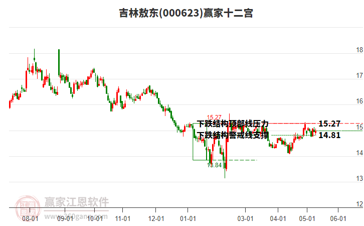 依據(jù)贏家江恩系統(tǒng)趨勢工具極反通道分析判斷吉林敖東000623運(yùn)行在生命線以下弱勢區(qū)域,根據(jù)規(guī)則該股短線輕倉參與,股價跌至弱勢外軌線后波段再結(jié)合其它工具信號建倉。應(yīng)用口訣是:生命線上強(qiáng)勢走,生命線下難抬頭;紅黃兩條外軌線,壓力支撐顯勢頭。