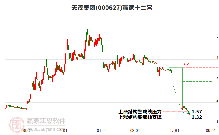 000627天茂集團(tuán)跳空低開(kāi)收上影十字星,跌破贏家十二宮上漲結(jié)構(gòu)警戒線