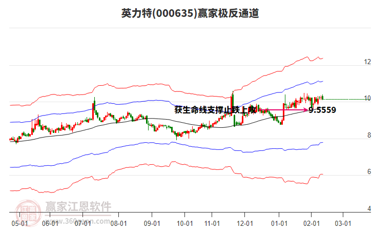 依據(jù)贏家江恩系統(tǒng)趨勢(shì)工具極反通道分析判斷英力特000635運(yùn)行在生命線以下弱勢(shì)區(qū)域,根據(jù)規(guī)則該股短線輕倉(cāng)參與,股價(jià)跌至弱勢(shì)外軌線后波段再結(jié)合其它工具信號(hào)建倉(cāng)。應(yīng)用口訣是:生命線上強(qiáng)勢(shì)走,生命線下難抬頭;紅黃兩條外軌線,壓力支撐顯勢(shì)頭。