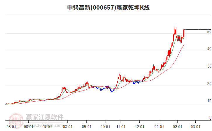 中鎢高新000657低開收大陽線,上穿贏家十二宮上漲結(jié)構(gòu)頂部線