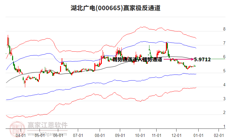 依據(jù)贏家江恩系統(tǒng)趨勢工具極反通道分析判斷湖北廣電000665運行在生命線以下弱勢區(qū)域,根據(jù)規(guī)則該股短線輕倉參與,股價跌至弱勢外軌線后波段再結(jié)合其它工具信號建倉。應(yīng)用口訣是:生命線上強勢走,生命線下難抬頭;紅黃兩條外軌線,壓力支撐顯勢頭。