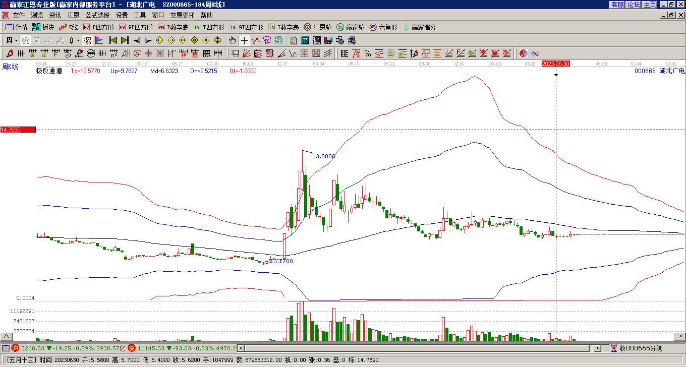 湖北廣電處于贏家江恩多頭中期回調(diào)形態(tài),從12月17日形成底分型后持續(xù)上攻,今日突破前高形成初次江恩筑底信號,中期多頭反彈趨勢延續(xù),但長期處于回調(diào)中。湖北廣電根據(jù)贏家江恩極反通道趨勢工具展示,上方壓力位