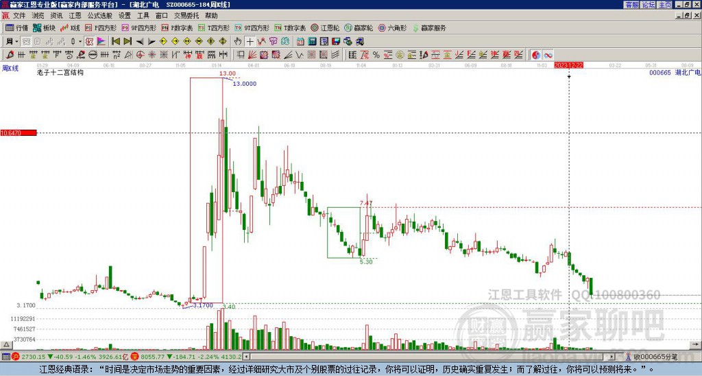 湖北廣電(000665)處于贏家江恩多頭中期回調(diào)形態(tài),12月31日發(fā)出江恩筑底信號后,經(jīng)過26日,今日形成短期筑頂信號,短期多頭趨勢已被破壞,中期多頭反彈趨勢延續(xù),但長期處于回調(diào)中。湖北廣電(0006