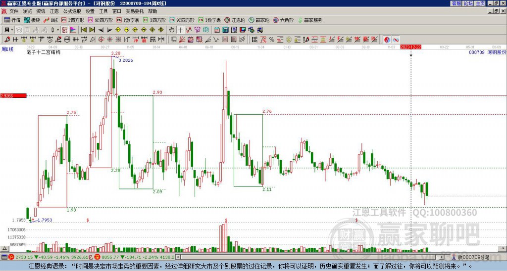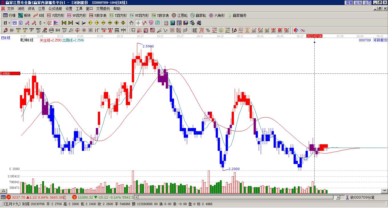 依據(jù)贏家江恩乾坤K線工具展示,目前股價處于紫色區(qū)域,本周K線以陰線收盤,關(guān)注線回調(diào)接近出局線,出局線對關(guān)注線形成支撐,密切關(guān)注此位置得失。近期高點為2.63,此位置不破,趨勢依舊看多。跌破此位置,趨勢反轉(zhuǎn)向下。