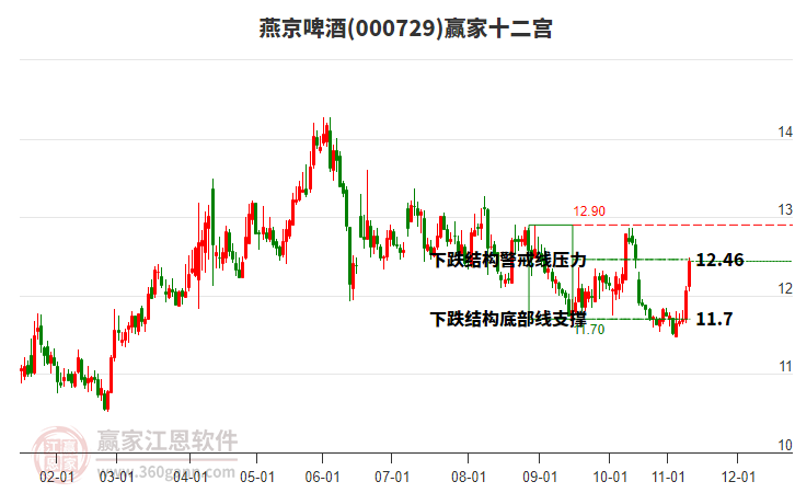 燕京啤酒(000729)從高點12.82,持續(xù)回調(diào)了17天,到達江恩價格循環(huán)線工具支撐位11.17元上