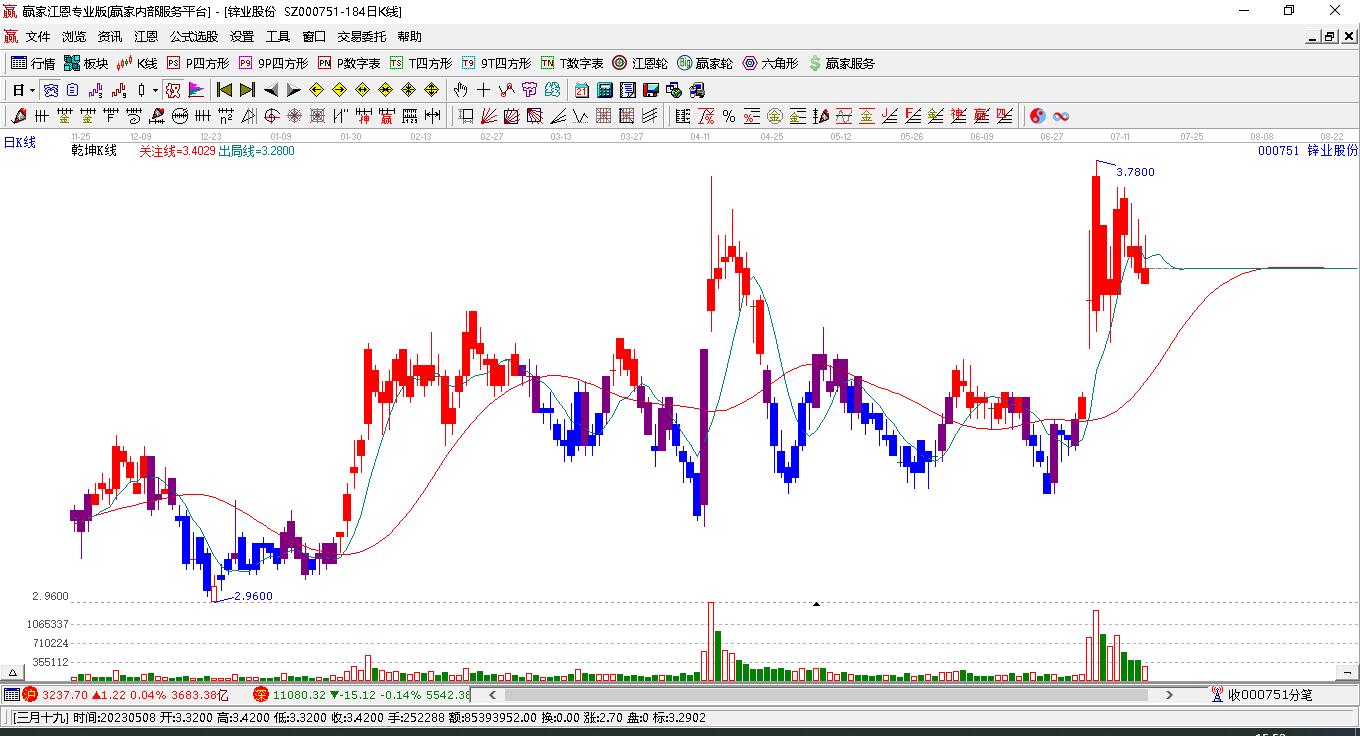 鋅業(yè)股份(000751)目前漲停,所屬板塊有色金屬短期底分型后持續(xù)上攻。鋅業(yè)股份(000751)截止目前突破黃金價(jià)格延伸線工具壓力位6.98元,根據(jù)贏家江恩黃金價(jià)格延伸線工具展示,上方第一壓力位7.3