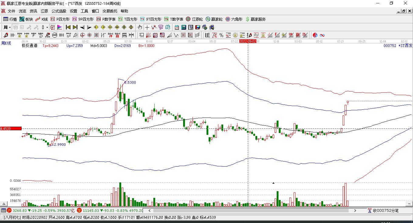 000752ST西發(fā)目前一字板漲停,走出獨立行情。000752ST西發(fā)截止目前突破極反通道生命線,根據(jù)贏家江恩極反通道趨勢工具展示,上方壓力位12.9327,下方支撐位11.2273。ST西發(fā)今日跳空