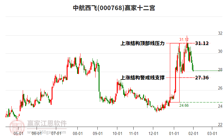 中航西飛近期高點(diǎn)31.96持續(xù)下跌,漲幅回落13.57% 中字頭股票概念今日跌幅2.92%