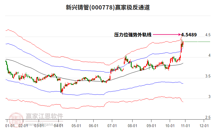 今日新興鑄管000778最高價5.22上穿了贏家極反通道工具上方紅色外軌線,受到上方紅色外軌線強力壓制,最終收盤停留在在上方紅色外軌線與藍色外軌線上方的超強通道區(qū)域。新興鑄管000778近10個交易日