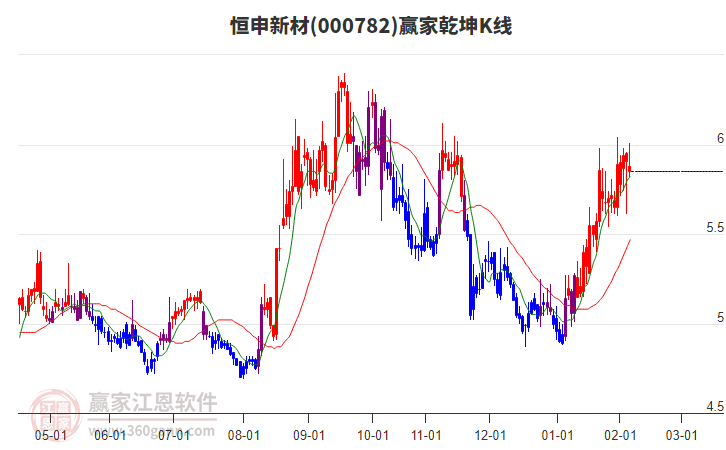 2月6日恒申新材000782最高價6.2上穿了贏家極反通道工具藍(lán)色外軌線,受到藍(lán)色外軌線強(qiáng)力壓制,最終收盤停留在在藍(lán)色外軌線與生命線上方的強(qiáng)勢通道區(qū)域。恒申新材000782近10個交易日漲幅7.72%