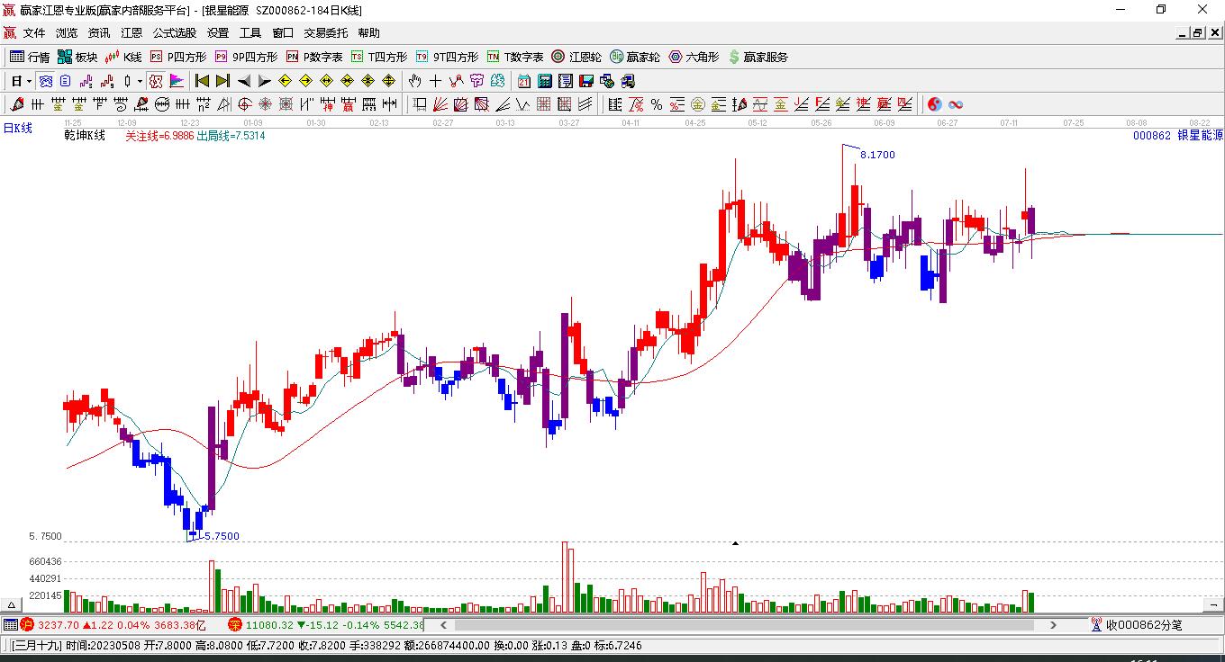 當(dāng)天銀星能源000862挑戰(zhàn)藍(lán)色外軌線(xiàn) 以上影小陽(yáng)線(xiàn)收盤(pán)