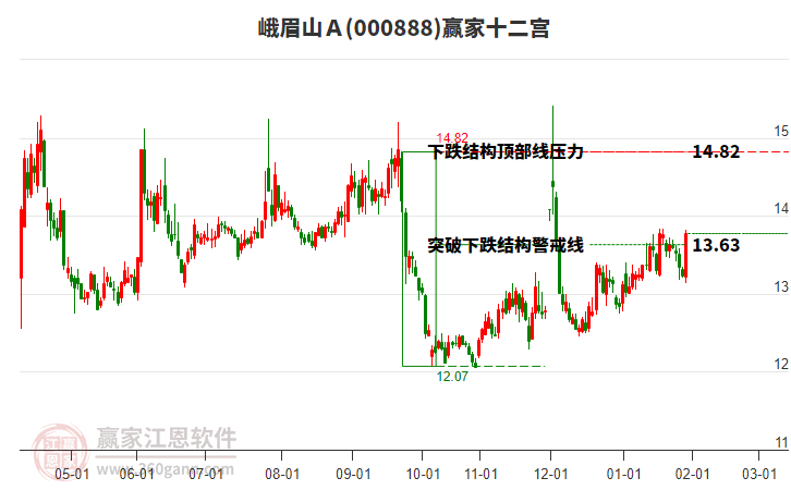 峨眉山A處于贏家江恩多頭次主線形態(tài),1月5日發(fā)出江恩筑底信號(hào)后,經(jīng)過3日,今日形成短期筑頂信號(hào),短期多頭趨勢已被破壞,中長期多頭趨勢依舊保持。峨眉山A根據(jù)贏家江恩極反通道趨勢工具展示,上方壓力位14.