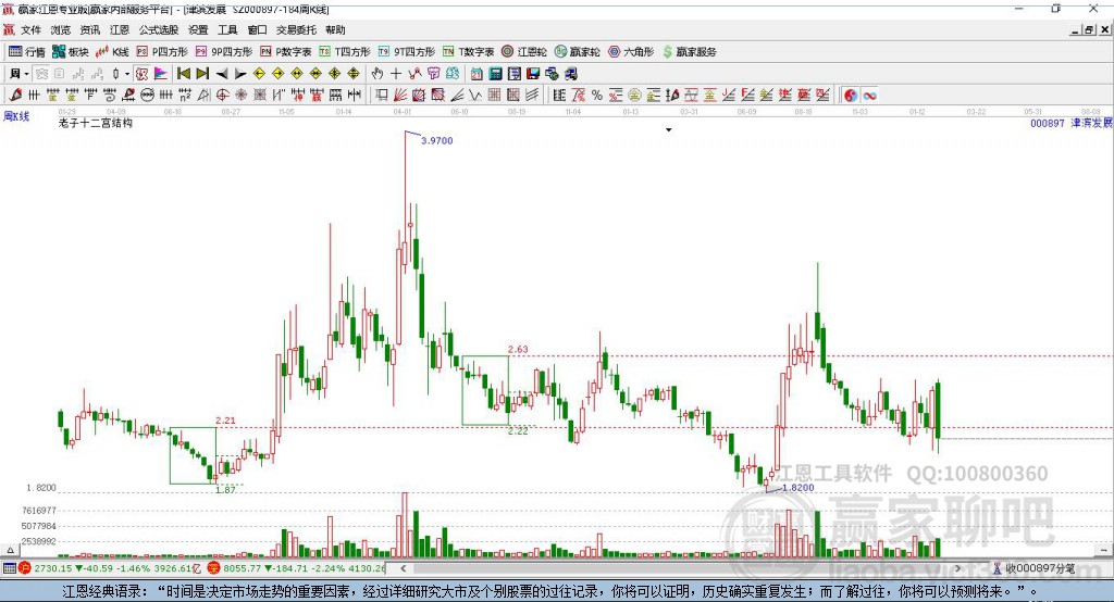 000897津?yàn)I發(fā)展處于贏家江恩多頭主線形態(tài),12月4日發(fā)出江恩筑頂信號(hào)后,經(jīng)過(guò)22日,今日再次發(fā)出江恩底分型并發(fā)出江恩筑底信號(hào),中期雖然處于回調(diào)中,但長(zhǎng)期多頭趨勢(shì)延續(xù)。000897津?yàn)I發(fā)展根據(jù)贏家江