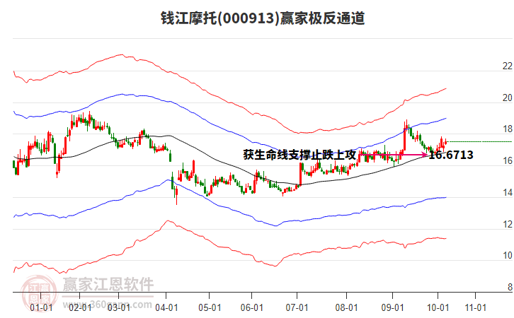 依據(jù)贏家江恩系統(tǒng)趨勢工具極反通道分析判斷錢江摩托000913運行在生命線以上強勢區(qū)域,根據(jù)規(guī)則該股可短線、波段結合操作;結合物極必反的原理通過分鐘圖做盤中差價,應用口訣是:生命線上強勢走,生命線下難抬頭;紅黃兩條外軌線,壓力支撐顯勢頭。