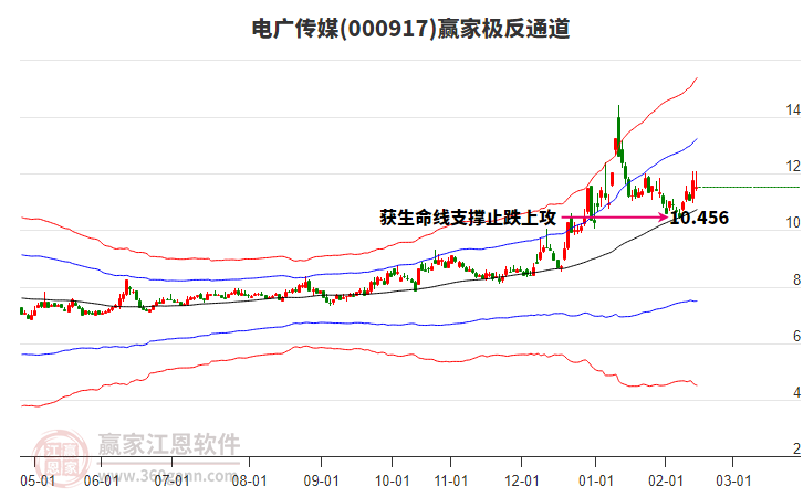 依據贏家江恩系統(tǒng)趨勢工具極反通道分析判斷電廣傳媒000917運行在生命線以下弱勢區(qū)域,根據規(guī)則該股短線輕倉參與,股價跌至弱勢外軌線后波段再結合其它工具信號建倉。應用口訣是:生命線上強勢走,生命線下難抬頭;紅黃兩條外軌線,壓力支撐顯勢頭。
