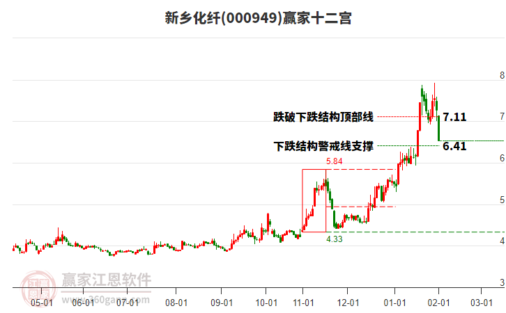 2月13日股價(jià)下穿前期2021年11月8日形成的下跌結(jié)構(gòu)頂部線,以穿頭破腳中陰線收盤,跌幅4.89%。依據(jù)贏家十二宮多空能量守恒規(guī)則,當(dāng)前股價(jià)下跌若不能收復(fù)下跌結(jié)構(gòu)頂部線7.11,多方能量持續(xù)萎縮,空方動(dòng)能充足,將會(huì)進(jìn)一步下探警戒線6.41,若能再次收復(fù)下跌結(jié)構(gòu)頂部線,有望再度展開上攻。