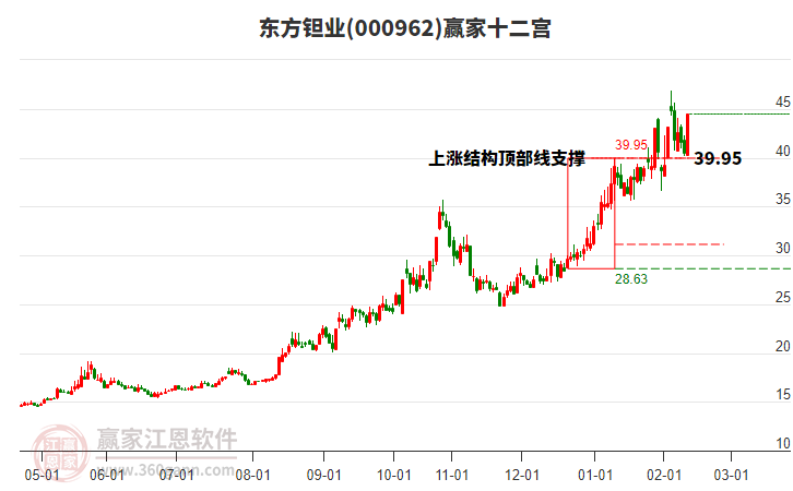 目前東方鉭業(yè)000962最高價(jià)44.13挑戰(zhàn)了贏家極反通道工具藍(lán)色外軌線,受到藍(lán)色外軌線強(qiáng)力壓制,最終收盤(pán)停留在在藍(lán)色外軌線與生命線上方的強(qiáng)勢(shì)通道區(qū)域。東方鉭業(yè)000962近10個(gè)交易日漲幅9.43%